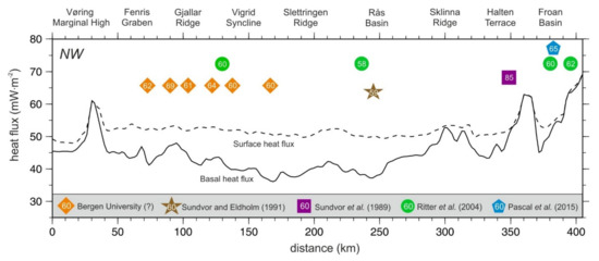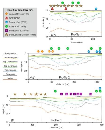 Some anomalously high surface heat flux values (>65 mW∙m−2) are reported in the intermediate and distal sectors of the margin. This is particularly noticed at the northern boundary of the Fenris Graben, Gjallar Ridge and Vigrid Syncline, along the Surt Lineament, where the measured/inferred heat flux from different sources [15,34] is consistently high, with most values between 70 and 90 mW∙m−2 (see map and Profile-1 in Figure 5). Some lateral heat flux variations appear to be structurally controlled, while the consistently high values in faulted structural highs may be associated with hydrothermal circulation [15]. This is consistent with the area being strongly tectonized. In contrast, the heat flux values reported in the southern Fenris Graben and Gjallar Ridge, in the proximity of the Jan Mayen Fracture Zone (Profile-2 in Figure 5), are lower, mostly around 60 mW∙m−2 [33], and within the expected for a quiescent passive margin. This is also the case for the deep Møre Basin, where the reported surface heat flux values are mostly between 40 and 60 mW∙m−2 [35].