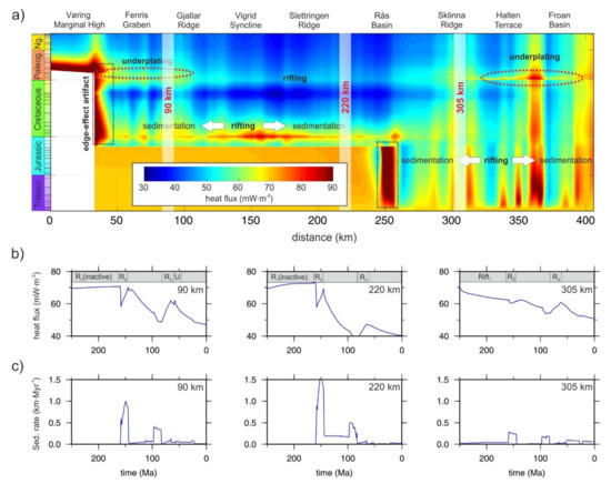 As depicted in the heat flux histories extracted at 90 and 220 km of the model, the Late-Jurassic high basement heat flux is largely overprinted by the very high sedimentation rates during this period of up to 1000–1500 m∙Myr−1 (Figure 6b,c, left and centre). The steep decrease in the basement heat flux between approximately 140 and 100 Ma is also partially due to the relatively high sedimentation rates throughout the Early Cretaceous, between 50 m∙Myr−1 and 200 m∙Myr−1, followed by a further depression during the Cenomanian–Coniacian (100–84 Ma), as the sedimentation rates increased to 350–500 m∙Myr−1. The effects of underplating are also clearly noticed in the heat flux–time map of Figure 6a, between 30 and 100 km of the model, and in the heat flux history extracted at 90 km of the transect, forming a second peak following rifting (Figure 6b, left).
