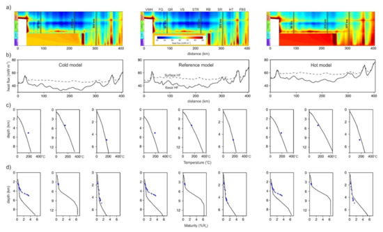 The calibration boreholes that are projected onto the model transect along the structural fabric of the margin (see Figure 1 for the location), with the projection distances increasing from approximately 10 km in the Halten Terrace (well 6406/8-1 at 305 km of the profile) to 15 km in the western Rås Basin (6505/10-1 at 220 km), 50 km in the eastern Vigrid Syncline (6504/5-1 at 190 km), 70 km in the western Vigrid Syncline (6603/12-1 at 120 km) and 100 km in the Gjallar Ridge (6603/5-1 at 90 km). It is unlikely, however, that the large deviations between observed and modelled, present-day thermal gradients (i.e., temperatures) are a result of borehole location only, since the burial history and structure of the lithosphere inferred from seismic data and potential field modelling do not changing dramatically along the projected locations [25], and the transient thermal effects associated with thicker underplating and sill intrusions in the central Gjallar Ridge have long subsided. Moreover, the temperature data available from other modelled boreholes [8] consistently indicate an increase in the geothermal gradients between the intermediate (Rås Basin) and more distal sectors of the margin (Vigrid Synclie and Gjallar Ridge; Figure 3a).