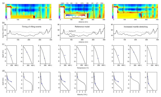 The basement heat flux history shown in Figure 6a accounts for the rifting and sediment blanketing effects, as well as those associated with the continental break-up and underplating. In the deep offshore, between 30 and 250 km of the model, approximately, the dominant pattern, is that of high heat flux during the Late-Jurassic rifting (up to 85 mW∙m−2), decreasing during the Early Cretaceous and early Late Cretaceous thermal quiescence of the basin. This is followed by a second, less prominent heat flux peak (up to 60 mW∙m−2) during the Late Cretaceous–Paleogene rifting and subsequent sinking during the Cenozoic post-rift burial.