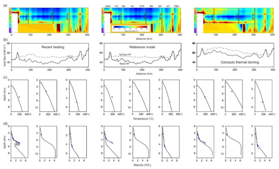 Sensitivity analysis comparing the predicted heat flux and the temperature and maturity calibration at projected borehole locations (see Figure 1 for the borehole locations) for the reference model (Centre) and for two alternative models, which account for the potential effects of hydrothermal circulation (Left) and deep-seated, long-term thermal anomalies (Right; see the text for discussion). See the caption of Figure 8 for a description of the plots.