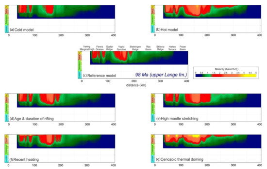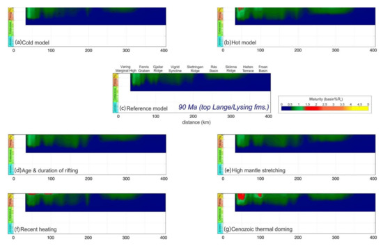 As discussed in Section 3.2., the reference model predicts pervasive oil and/or gas maturity of a late-Albian–Cenomanian horizon (98 Ma; upper-Lange formation) across the southern Vøring Basin, initiating during the Late-Cretaceous–Paleocene rifting and evolving throughout the Cenozoic burial (Figure 12c). In the cold model, the area of potential gas generation–expulsion is limited to the Fenris Graben and the deepest parts of the Vigrid Syncline (Figure 12a), while the hot model predicts a gas mature horizon between the Rås Basin and the Fenris Graben, with recent generation limited to the basement highs, such as the Gjallar and Slettringen ridges (Figure 12b).