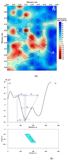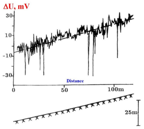 From other side, as follows from the very detailed SP measurements of Ernstson and Schrerer [39], at the inclined topographic surface, the SP field increases directly with increases in the relief highs (Figure 2).