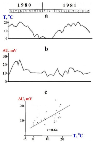 Ernstson and Schrerer [39] monitored SP and temperature anomalies during 15 months in 1980–1981 (Figure 3). The correlation between SP and soil temperature is interpreted as result of the influence of the thermal diffusivity and convection processes in the subsurface [39]. Between these parameters, a correlation of r = 0.64 was established. It is a low relationship, but in any case, should be taken into account.