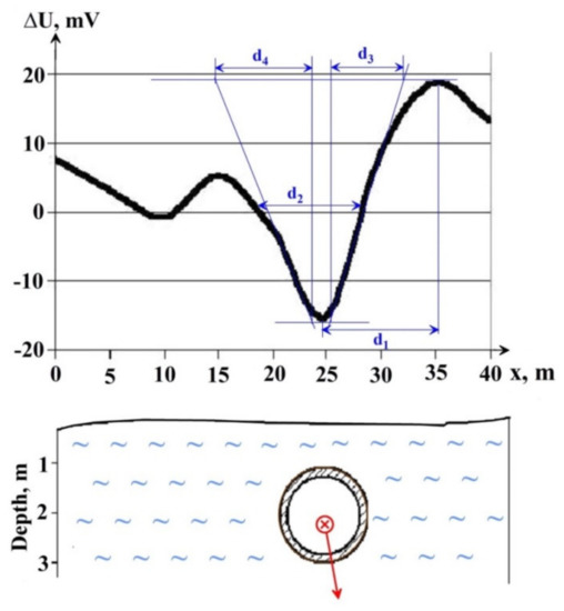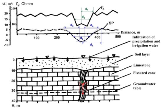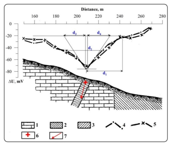 In the SP method, terrain relief influence is two-fold. On the one hand, negative SP anomalies caused by electromotive force can be created over the positive topographic forms (this phenomena strongly depends on the peculiarities of underground water circulations). Comparison of the SP graphs with topographic data usually allows for the identification of anomalies of this type by the character mirror image of the terrain relief in SP anomalies [38].