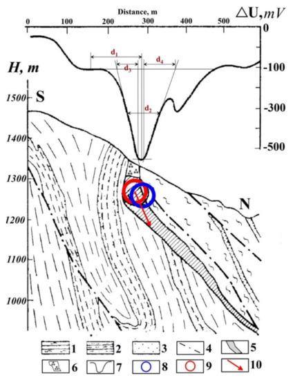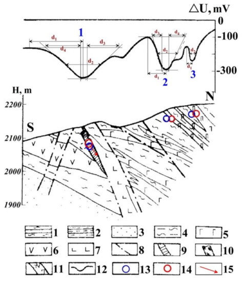 - Erofeev, L.Y.; Orekhov, A.N.; Erofeeva, G.V. Natural electric fields in Siberian gold deposits: Structure, origin, and relationship with gold orebodies. Geol. Geophys. 2017, 58, 984–989. [Google Scholar] [CrossRef]