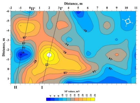 The SP anomaly level may affect some environmental factors. One of these factors is the shadowing of a part of the investigated area. For instance, Revil and Jardani [43] documented the fact that the difference between the SP electrodes placed in cold and warm media may exceed 10 mV. Another factor is a presence of some hygrophilous plants (e.g., hazel and almonds) whose roots can pick over a lot of moisture from the upper part of the geological section (thereby hindering the SP anomaly generation).