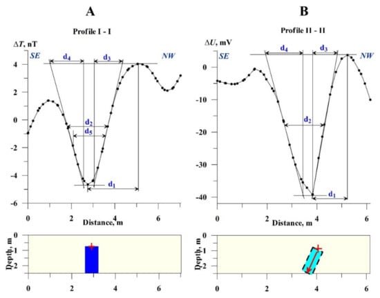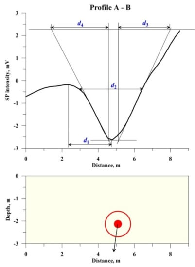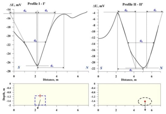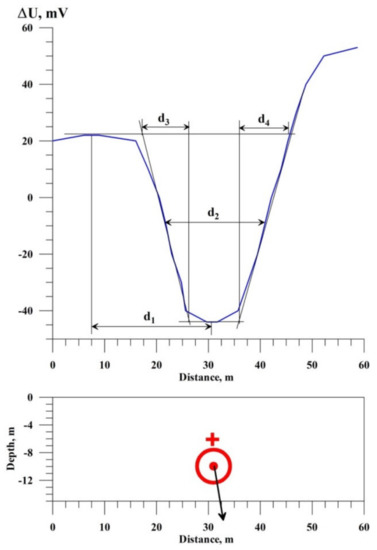 The improved methods for SP anomaly analysis include characteristic points, tangents and areal methods (these methods are described in detail in the publications suggested to magnetic anomaly interpretation: e.g., [38,40,72,81,82]. Formulas for interpreting SP anomalies by use of the characteristic point method are presented in Table 3. Several figures below display some peculiarities of the characteristic point and tangent methods application.