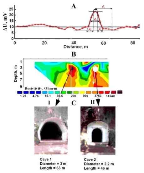 - Shevnin, V.A.; Bobachev, A.A.; Ivanova, S.V.; Baranchuk, K.I. Joint analysis of self potential and electrical resistivity tomography data for studying Alexandrovsky settlement. In Proceedings of the 20th European Meeting of Environmental and Engineering Geophysics, Athens, Greece, 14–18 September 2014; pp. 1–5. [Google Scholar] [CrossRef]