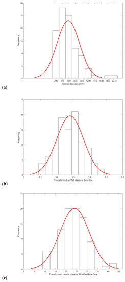 Before the transformation, the normality measures for the original rainfall data were = 5.78 and = 1.41. After the transformation using the Box-Cox method (Equation (3)) which calculated k = −0.24, the normality measures maximizing Equation (4) were improved significantly as is now equal to 2.61 and = 0.12, which are closer to the typical values of the normal distribution. On the other hand, the Modified Box-Cox method similarly significantly improves the normality metrics, with calculated λ = 0.38 and α = 7.64, delivering = 3.0 and = 0.22. In Figure 2, frequency histograms fitted the gaussian curve, and present the distribution of the original data and the improvement of the transformed data normality using both methods. The Modified Box-Cox method competes the Box-Cox, with its metrics to deviate, on average, less from the typical normal distribution values (Table 2).