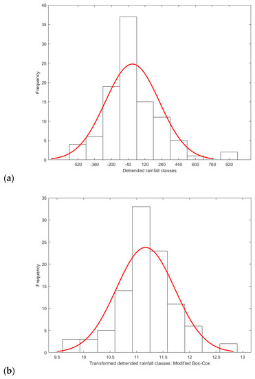 The significant advantage of the Modified Box-Cox method is its application on negative sign data. The detrended data (fluctuations) normality metrics were = 5.46 and = 0.98, while after the transformation, which calculated λ = 0.12 and α = 23.3, were = 4.17 and = 0.01. Although the kurtosis coefficient is not very close to the optimum value, it is significantly improved, and the skewness almost fits the optimum value. Figure 3 provides the improvement on the detrended data gaussianity. Moreover, the proposed Modified Box-Cox method provides improved results compared to other transformation functions that treat negative sign data. The complete gaussianity metrics of the original and detrended rainfall data, and of the transformed ones, are presented in Table 2.