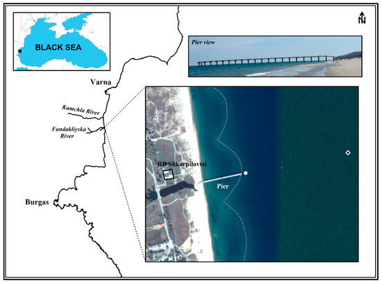 Description and location of the study site. The satellite view shows the location of the field site on the Bulgarian Black Sea coast and indicates the positions of the research station ‘Shkorpilovtsi’, the pier, and the state of the crescentic bars (dashed grey line) along the coastline on 24th September 2009; white diamond—extraction point of the climatic wave data, depth 17 m; white star—same for wave time series, depth 4.4 m; data sources: the Black Sea basin map was taken from free maps platform [43] and the satellite image was acquired by Maxar Technologies, USA [44].