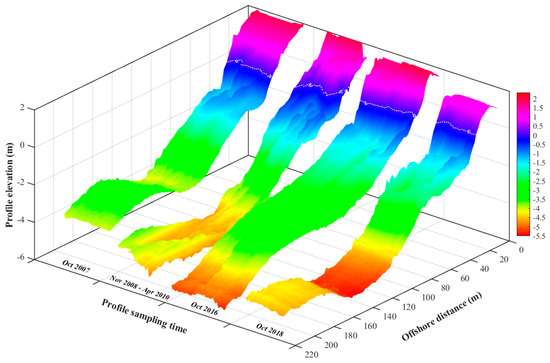 Coastal morphodynamics constructed from cross-shore profile measurements for all field experiments in October 2007, November 2008–April 2010, October 2016 and October 2018 at Kamchia-Shkorpilovtsi beach; white dashed line—contour of the mean sea level.