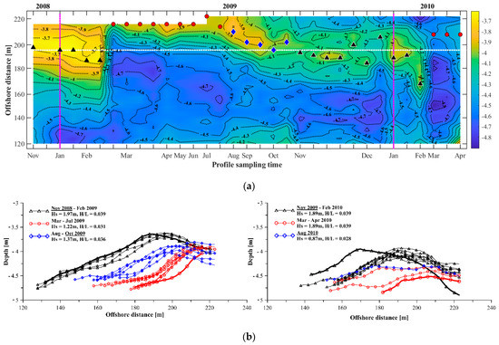 Intra-annual morphodynamics of the outer sand bar: (a) chronological seabed relief changes in November 2008–April 2010; colors and symbols of bar crest positions correspond to profile groups as described below in the caption text; vertical magenta lines—beginning of each year, horizontal white line—reference winter bar crest location defined from 2009 data; (b) outer bar profile envelopes of temporal variations (sweep zones) for November 2008–October 2009 (left panel) and November 2009–August 2010 (right panel), Hs and H/L—seasonally averaged monthly maximum values of the parameters at depth 4.4 m; black lines with triangles—winter pro-files, red lines with circles—summer profiles, and blue line with diamond—transitional profiles; heavy black line with triangles—last measured profile prior to the abrupt seaward bar shift, heavy red line with circles—first profile after the bar’s displacement to its summer location.