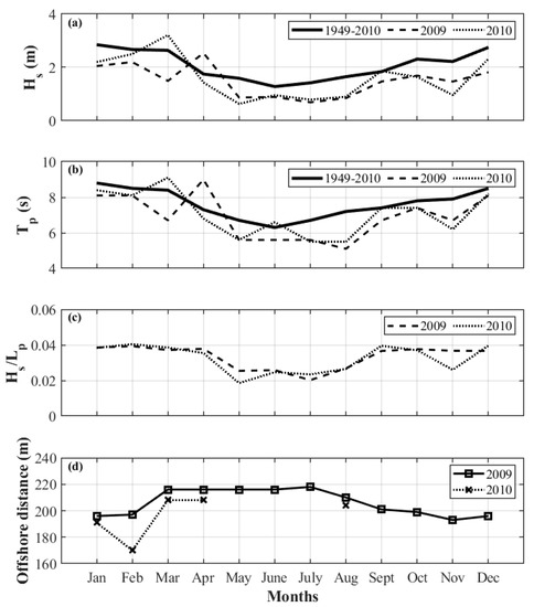 The initial steps to analysis of the annual and seasonal bar evolution were to examine the dependence between bar crest locations in 2009–2010 and wave parameters such as significant wave height Hs, peak period Tp and wave steepness Hs/Lp (Figure 4).