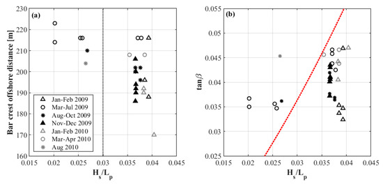 Dependence of steepness Hs/Lp of transformed monthly Q99 waves (depth 4.4 m) for 2009–2010 on (a) the offshore distances of the outer bar crest, black dashed line—wave steepness threshold, and (b) the mean slope tanβ, red dashed line—criterion for identification of non-linear wave transformation scenarios [tanβ = 7(Hs/Lp)3/2]; black symbols—2009 values, grey symbols—2010; circles—seaward bar crest positions, triangles—shoreward bar crest locations, stars—bar crest displacements.