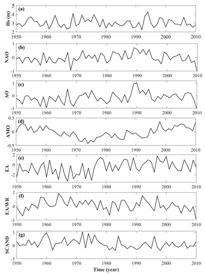 Variations of (a) 99th quantile of the significant wave height and (b) the North Atlantic Oscillation (NAO), (c) the Atlantic Multi-decadal Oscillation (AMO), (d) the East Atlantic Oscillation (EA), (e) the Arctic Oscillation (AO), (f) the East Atlantic-Western Russia (EA/WR) and (g) Scandinavian (SCAND) patterns for 1950–2010.