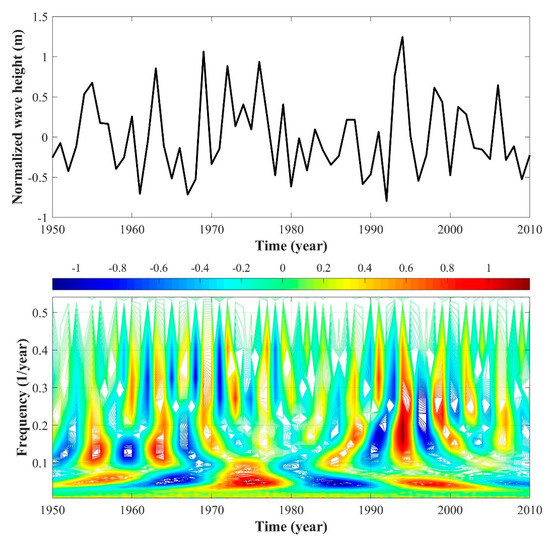 A previous study by [68] has shown that fluctuations of climate indices are also non-stationary, which makes it impossible to apply the classic correlation analysis to determine the relation between them and the wave height variations. However, a methodology to correlate two non-stationary process based on wavelet analysis was developed in [68,72]. According to this method, mutual correlation functions were calculated between the same frequency scales of two wavelet decompositions, which gives the advantage of having both correlation coefficients and frequencies, where these coefficients have the largest values.