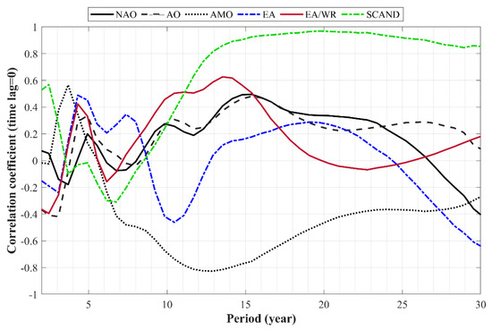 Wavelet correlation coefficients (with time lag = 0) of the maximum wave height variations for selected climate indices are presented in Figure 9. If one considers that correlation coefficient >0.4 represents good correlation between geophysical processes, then for large (multi-decadal) time spans of 20–30 years variations of wave heights depend on indices the EA and the SCAND, respectively. Fluctuations corresponding to 10–15 years depend on the EA/WR (9–13 years), the EA (10–11 years), the AMO (13 years), the NAO (15 years) and the AO (15–16 years). There are also fluctuations of the order of few years that depend on the EA (4–5 years), the EA/WR (4 years), the AMO/AO (3 years), the SCAND and the EA/WR (2 years).