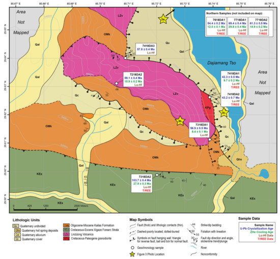 The Dajiamang Tso rift is located in the Gangdese Range (a.k.a. the Transhimalaya Range) of southern Tibet. This region is located within the Lhasa terrane immediately north of the Indus-Yarlung suture and comprises four major lithologic units. The northernmost of these is the Linzizong Formation [52], a nonmarine sedimentary unit containing volcanic and volcaniclastic rocks of Late Cretaceous-Early Paleogene age [53,54,55,56]. Linzizong volcanic rocks are interpreted to be genetically liked with plutonic igneous rocks of the Gangdese Batholith, which mainly crop out to the south in the Dajiamang Tso region (Figure 2). These calc-alkaline intrusive rocks of the Gangdese Batholith [57,58,59] comprise the second major unit in the southern Gangdese Range and are roughly age-equivalent to the overlying Linzizong volcanic rocks. Formation histories of both lithologic units are associated with continental arc magmatism as a result of northward subduction of the Neo-Tethyan lithosphere during the Late Cretaceous-Paleogene [52].