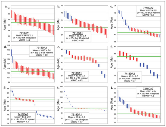 Zircon U-Pb geochronology weighted-mean age results by sample (a–i). Ages were calculated using the TuffZirc algorithm [82] from the Berkley Geochronology Center’s ISOPLOT program [83]. Box heights are 2σ. Panels in the lower left of each graph display sample name, weighted-average crystallization age, sample size, and MSWD (mean square weighted deviate). Complete zircon U-Pb Geochronology results for individual grains can be found in Supplementary Table S1.