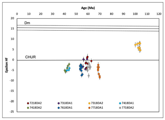 Epsilon Hf (176Hf/177Hf) values for igneous zircons plotted against corresponding U-Pb geochronology crystallization ages. More negative values represent more evolved isotopic signatures. Chondritic Uniform Reservoir (CHUR) line depicts expected crustal composition of bulk silicate earth. Depleted Mantle (DM) line represents the natural depletion of incompatible elements within the mantle over time. Note the change in epsilon Hf values from ~100 Ma grains to 70-40 Ma grains. Complete zircon Lu-Hf isotope geochemistry results for individual grains can be found in Supplementary Table S2.