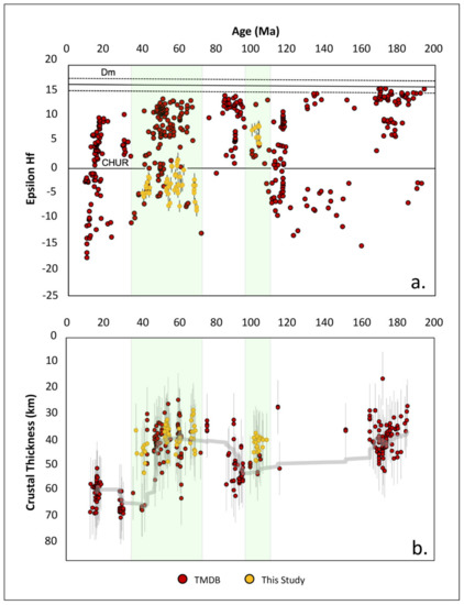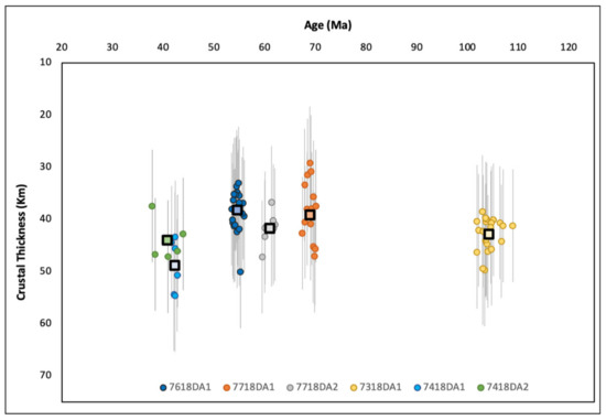 Trace/rare earth element (T/REE) geochemistry crustal thickness estimates for igneous zircons plotted against corresponding U-Pb geochronology crystallization ages. Crustal thickness estimates were calculated using the equations of Sundell et al. (2021) [89] modified from the original equations calibrated by Profeta et al. (2015) [21]. These equations utilize La/Yb ratios as proxies for depth of magma diversification and, thus, crustal thickness at the time of crystallization (see Supplementary Figure S2). Error bars represent ± 10.8 km (2σ) residuals [89]. Larger circles with black outlines represent mean crustal thickness estimates for each sample. Moving right to left through time across the chart, average crustal thickness estimates decrease thickness from ~100 Ma to ~70 Ma, followed by increasing thickness estimates until ~40 Ma. Complete zircon T/REE geochemistry results for individual grains can be found in Supplementary Table S3.