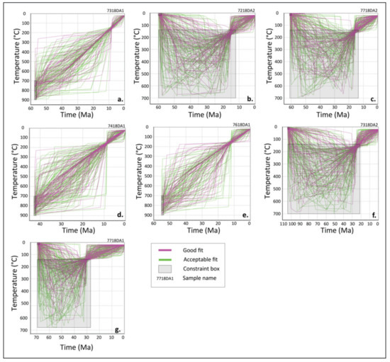 HeFTy [87] inverse modeling results for seven samples (a–g) displaying “good” (purple) and “acceptable” (green) time–temperature paths for each sample based on n = 10,000 model runs. Black boxes with gray shading represent geologic controls: For intrusive samples, U-Pb geochronology ages were used in conjunction with assumed zircon crystallization temperatures between 900–700 °C to constrain path start points. For extrusive samples, U-Pb geochronology ages were used with the assumption that samples were erupted at surface conditions (0–25 °C) to constrain path start points. Subsequent constraint boxes were implemented for extrusive samples because ZHe cooling ages require burial up to at least 140° (within the ZHe partial retention zone (PRZ)) following crystallization. All model runs require T-t paths to terminate at surface conditions (25 °C) at 0 Ma. “Best fit” and “weighted mean” paths are not displayed to allow the viewer to better identify concentrations of “good-fit” path clusters.