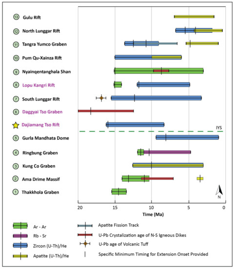 - Styron, R.H.; Taylor, M.H.; Sundell, K.E.; Stockli, D.F.; Oalmann, J.A.; Möller, A.; McCallister, A.T.; Ding, L.; Liu, D. Miocene initiation and acceleration of extension in the South Lunggar rift, western Tibet: Evolution of an active detachment system from structural mapping and (U-Th)/He thermochronology. Tectonics 2013, 32, 880–907. [Google Scholar] [CrossRef]