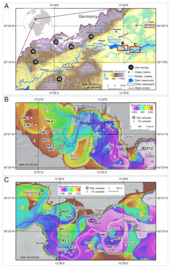Maps of the Ohře River catchment with major ore regions and mountains (A). Detailed DTM and position of OSL sampling sites in the areas upstream (B) and downstream Žatec (C). Position of areas in panels B and C is shown by red rectangles in panel A.
