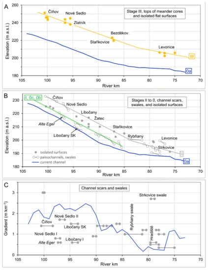 Longitudinal elevation profiles of current channel and prominent flat surfaces in fluvial stage III (A). Elevation profiles of current channel, palaeomeander scars, swales in meander cores, and isolated remnants of flat surfaces of stages 0, I and II (B). The slopes of active channel and palaeochannels (in ‰, or m km−1) estimated from current DTM (C). All elevations and slopes were projected to river km of the current channel perpendicularly to the valley axis. Žatec is in the 90th river km.