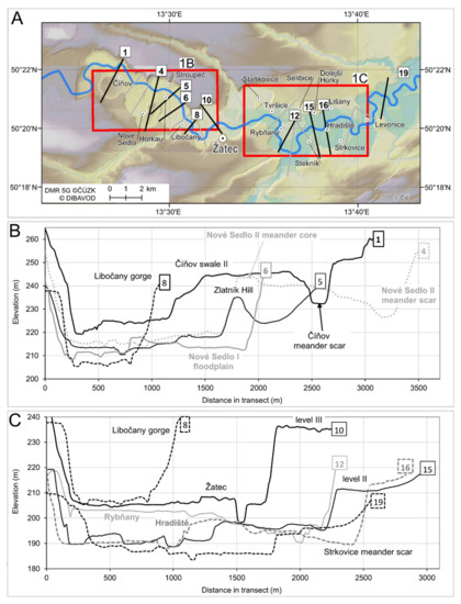 Elevation transects through the river valley in positions shown in panel A. Red rectangesl in panel A shows areas depicted in Figure 1B,C. Definition of terrace levels/development stages upstream (B) and downstream Žatec (C). Labels of terrace levels and meander names are listed in Table 1.