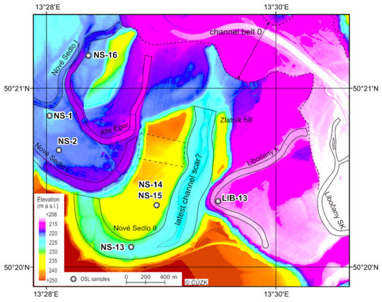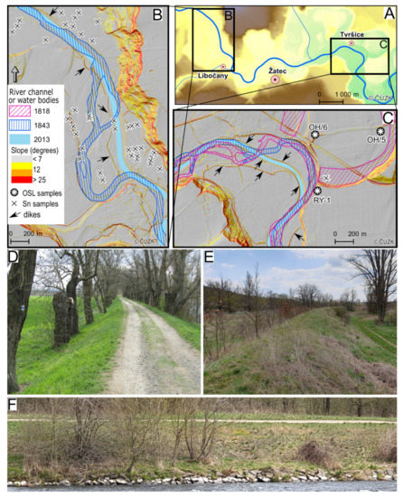 On the active floodplain (0) three channel belts were identified. The most recent channel belt (0a) has been shaped by river channel engineering, particularly by channel straightening and shortening in the 20th century. The engineering is particularly obvious in the channel topography upstream of Libočany (Figure 5B) and near Tvršice (Figure 5C). The original (pre-engineered historical) multi-channel system (0b) is clearly discernible in the DTM upstream of Libočany (Figure 4). The deepest meander scars correspond to the channel position in the SK map from the first half of the 19th century. Dikes were constructed around the artificial 20th century channel (Figure 5D,E), mainly downstream of Žatec, to protect the villages, crop fields, and hop gardens in former palaeomeanders. Lateral channel movement near settlements and towns are prevented by revetment (Figure 5F). Based on their geomorphological setting and the applied dating methods, the fragments of an older channel belt (0c) were also identified. These palaeomeanders have been preserved at the distal parts of the active floodplain.