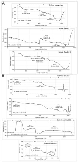 Based on the topography (e.g. Figure 1B,C) and elevation transects drawn roughly perpendicularly to the valley axis (Figure 3), characteristic surfaces and form assemblages were identified. These represent fluvial stages labelled from 0 to III according to Elznicová et al. [16], and also presented in Table 1.