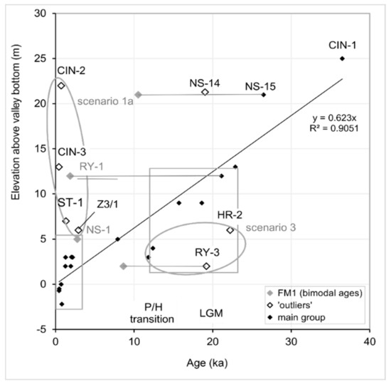 The plot of elevation against OSL ages at the sampling sites (Figure 7) shows a general incision tendency of the river valley floor since (at least) the Last Glacial Maximum (LGM; terminated 19–20 ka). The oldest age yet obtained, 36.50 ± 2.89 ka at the top of the Číňov meander core (CIN-1), fits the same trend.