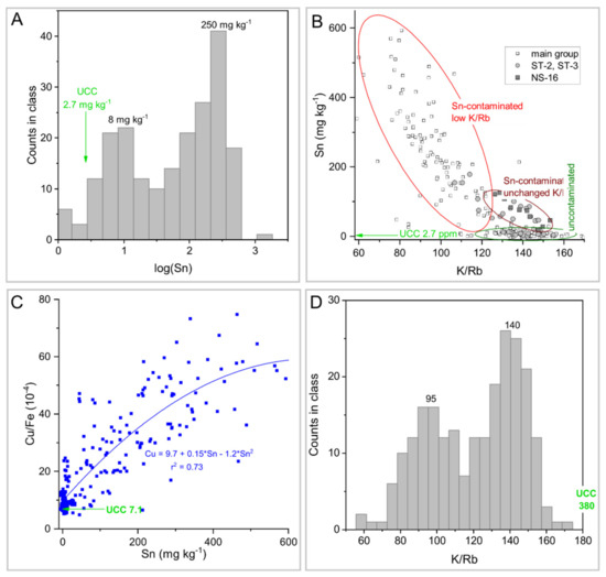 Stack of geochemical characteristics. Histogram of Sn concentrations with modal maxima (A), the relation between Sn and K/Rb (B), correlation of Sn and Cu (C), and histogram of K/Rb (D). UCC values are in green ink and arrows to corresponding axes.