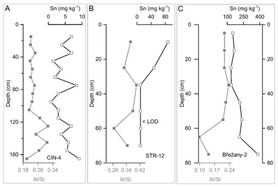 Concentrations of Sn are elevated in conjunction with those of Cu, Pb, and Zn (only Cu/Fe vs. Sn is shown in Figure 8C), which supports their attribution to ore mining and processing in the Ohře River catchment. The Cu/Fe ratio is plotted in Figure 8C instead of the raw Cu concentration to minimise the grain-size control of the sediment contamination by potentially mobile divalent metals [53]. Mining of Sn and other metal ores in the Ohře River catchment peaked in approximately the same period (16th century) for all the mined metals. Their concentration depth profiles are similar, although each of the exploited metals (Cu, Sn, and Pb) was present in specific minerals and distinct ore regions [32,37]. For instance, Cu was mined near Kraslice, Pb near Oloví, and Sn in all other ore regions, as shown in Figure 1A.