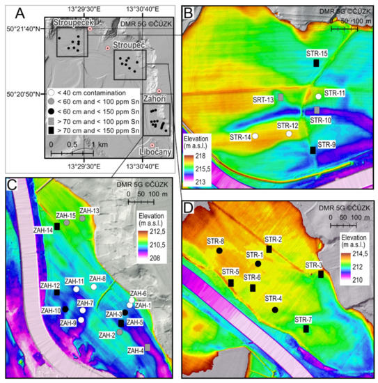 Recent channel belts (stage 0) upstream Žatec were sampled extensively (A). Detailed DTM and Sn contamination in Stroupeček (B), Stroupeč (C), and Záhoří (D). Position of areas in panels B to D is indicated by black rectangles in Figure 1B.