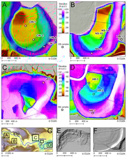 Detailed DTM of meander cores (A–D) and meander edges (E,F). Bellow the top of large meander cores in Číňov (A), Nové Sedlo (B) and Staňkovice (C) the low-sinuosity palaeochannel scars are found (indicated by straight lines in (B) and (C)). Staňkovice (C) and Hradiště-Strkovice meander cores (D) have nearly triangular shape rather than expected circular meander core. Edges of palaeomeanders cut into Oligocene to Miocene loose sandy sediments in Stroupeček are irregular (E), while in Selibice they are smooth (F) as the result of more cohesive Miocene clayey strata. Position of areas A–F are shown in inset (G).