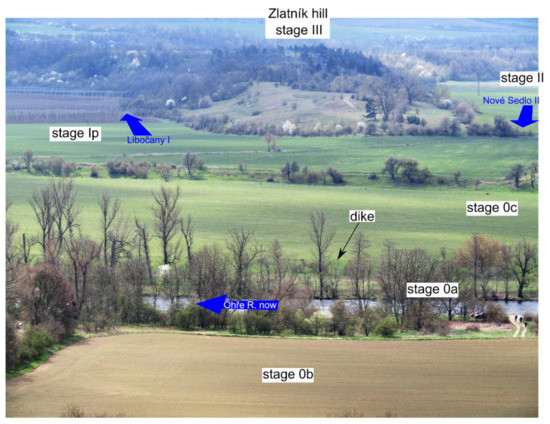 The entire Ohře River catchment has been intensively used by humans since pre-historical times, from the river valley to the montane regions. The Žatec area has settled since the Neolithic period. The archaeological findings in the Žatec area have been summarised by Holodňák [35]; commonly found are graves, ceramic vessels and shards, and tools from the Neolithic, Bronze Age, and younger periods. These settlements were found in the city of Žatec and practically in all historical villages. In level 0 of the floodplain, traces of pre-historic settlements are absent. In level I, they are exceptional, as that observed in site Horkau (in the historical SK map) or “ovčárna” (sheep farm) situated north of the Nové Sedlo village at 219 m a.s.l., which is 6 m above the current level 0a. Moreover, artefacts from slightly above the surrounding floodplain level show occupation from the Neolithic period to the 19th century. Other long-term settled sites at relatively low elevations above the floodplain are in Libočany (ca. 215 m a.s.l. and ca. 8 m above level 0a, i.e., at level II). Another persistently occupied region was the Staňkovice village at the slope of the palaeomeander II core. Other archaeological findings were identified at higher terraces.