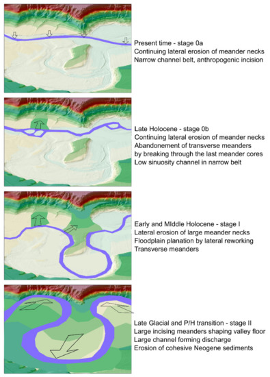 The elevation-age misfits can be interpreted by the scenarios presented in Table 4. Among them, particular attention should be given to scenario 3, wherein repetitive erosion and accumulation of sediments occur in stage II during the LGM, and between the LGM and P/H transition, i.e., erosion/deposition/remodelling of the meander cores. The current surface of the floodplain in scenario 3 would be an envelope of a time-series of erosion bases of several P/H channels, with the vast majority of temporarily deposited sediments eroded before the ultimate abandonment of the last channels of such large meanders. This envelope would show (in current topography) the deepest local erosion of the cohesive Miocene bedrock (covered by the Quaternary channel armour) rather than the unidirectional downslope formation of scroll bars. Previous studies have attributed distinct parts (elevation intervals) of the slopes of these meander cores to distinct glacial/stadial periods [19,20]. We assigned these distinct elevation intervals to a set of erosion bases representing a much shorter time interval during the Late Glacial. This is presumably attributable to the environmental disruptions between the LGM (ca. 22–18 ka) and the Holocene, such as the Bølling-Allerød interstadial and Younger Drays stadial.