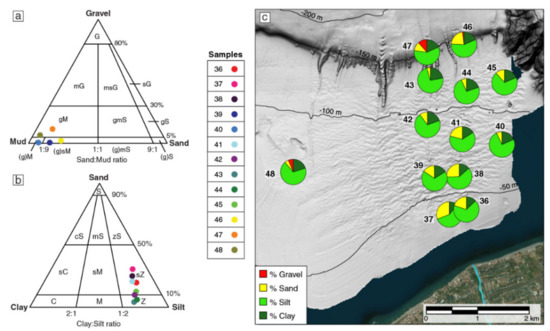 The samples analyzed in this work consist mainly of sediment with silt fraction between 57% and 75% (e.g., [48,49]; see Figure 2 and Table 2) and clay and sand content between 10 and 22% and 4–30%, respectively; five samples (39, 40, 46, 47 and 48) also have a minimum gravel content, with percentages of 0.1–11%. The mean size ranges between 4.9 φ and 6.7φ. The sediment is generally poor with an overall symmetric distribution, except for samples 46, 47 and 48, which are very poorly sorted and coarse/very coarse skewed, and samples 36, 37 and 38 with a fine skewness. A platykurtic or slightly mesokurtic sediment distribution is common, again except for samples 46, 47 and 48, for which the distribution curve is leptokurtic. By considering the distribution of the samples (Figure 2c), these results indicate an overall downslope decrease in sand content, except for samples 46 and 47 (recovered within the upper slope gullies), which also yield the maximum gravel content.