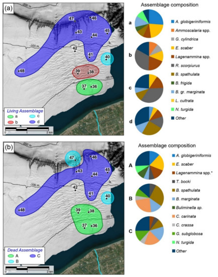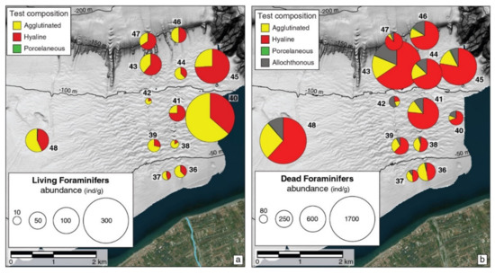 Test composition of living (a) and dead (b) foraminifera in the study area. Each pie chart is proportional to foraminiferal relative abundance. The size of the pie charts is based on average density values from the 0–5 cm sampled sediment interval.