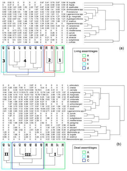 A two-way hierarchical cluster analysis (HCA) was applied on the matrices of living and dead specimens to recognize groups of samples with homogeneous foraminiferal content, likely indicating uniform ecological conditions. For both living and dead data, simplified matrices of species abundance occurring in the 0–5 cm sediment interval were used only for those species showing relative abundances greater than 5% in at least one station [74]. Samples 42, recording an insufficient number of benthic foraminiferal individuals, was not considered for the statistical analysis. The HCA was carried out with the statistical package Paleontological Statistics (PAST) [76,77], using the group average method on a Bray–Curtis similarity matrix derived from square-root transformation of the data.