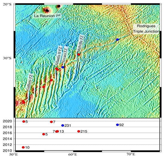 The Southwest Indian Ridge (SWIR) is a major seafloor spreading ridge separating Africa and Antarctica. It extends from the Bouvet Triple Junction in the southern Atlantic Ocean to the Rodrigues Triple Junction (RTJ) in the Indian Ocean [,,]. The western end of SWIR is older than its eastern end due to the lengthening and eastward propagation of the ridge axis toward the RTJ [,]. The SWIR is among the world’s slowest spreading ridges, with a full spreading rate of ~14 mm/a [,,]. It is also characterized by several large-offset transform faults that divide the ridge into spreading segments of various lengths [,] with several magmatic and amagmatic ridge segments [] and a deep axial valley bounded by ~3 km high ridges [,,]. The cyclic nature of volcanic construction and tectonic dismemberment across the SWIR is responsible for the ridge crests and rugged morphology of this spreading ridge []. As shown in Figure 1, the SWIR is mostly characterized by the obliquity of the ridge axis with respect to the main fracture zone’s (FZ) orientation [,]. The section of the ridge between the Gallieni (52° E) and Melville FZ (60° E) shows an obliquity of 40° and contains several long-lived transform and non-transform discontinuities. The section between Melville FZ and RTJ (70° E) has an obliquity of 25° and is continuous with minor discontinuities.