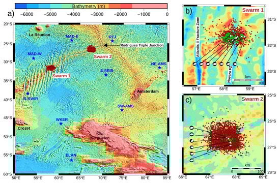 The locations of the two 2018 swarms along the Southwest Indian Ridge: (a) hydroacoustic events (red dots) detected by the OHASISBIO network of hydrophones (blue stars); (b,c) enlarged sections for swarm-1 along ridge Segment 18 and swarm-2 along ridge Segment 4 with the hydroacoustic events (red dots), events from the land-based ISC catalogue (green dots), and events with MW > 5.0 (white dots) along with their focal mechanisms (GCMT catalogue []).