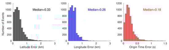 The analysis of the data was iterated twice for each swarm. We constructed a first hydroacoustic catalogue (OHA catalogue) containing event information such as the event ID; its latitude, longitude, and SL; the number and names of hydrophones used to locate the event; the calculated errors in the latitude, longitude, origin time, and SL. In a second iteration, we used this event information to re-pick and re-locate the hydroacoustic events. This step improved the catalogue by reducing the errors in latitude, longitude, and origin time by ~10-fold. The median errors in latitude, longitude, and origin time for all events from swarm-1 and swarm-2 (total 5989 events) were 0.33 km, 0.26 km, and 0.18 s, respectively (Figure 3). In the first iteration, the median errors were 4.33 km in latitude, 3.60 km in longitude, and 1.99 s in origin time; then, in the second iteration, the errors improved (by ~10-fold) to 0.44 km, 0.35 km, and 0.19 s, respectively, for swarm-1 events (Figure S1). Similarly, for swarm-2, the median errors improved (by ~11-fold) from 4.00 km to 0.33 km in latitude, 2.89 km to 0.26 in longitude, and 1.92 s to 0.18 in origin time (Figure S2).