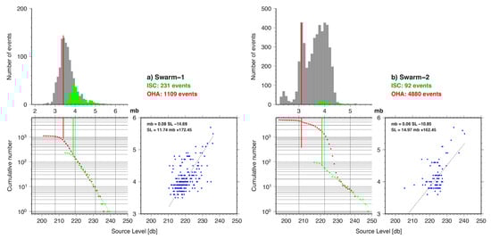 For swarm-1, the ISC catalogue yielded a b-value of 2.96 (Figure 4a), much greater than the expected value of 1 typical for seismically active regions. The magnitude (mb) and SL of completeness of the ISC catalogue events were MC(ISC) = 3.9 mb and SLC(ISC) = 218 dB, respectively. For the OHA catalogue, the SLC was 6 dB lower and reached 212 dB, equivalent to MC(OHA) = 3.4 mb. This improvement in the magnitude of completeness led to ~5 times more events in the OHA catalogue than in the ISC catalogue (1109 vs. 231).