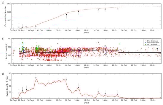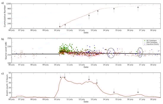 Temporal distribution of Swarm-2 events: (a) cumulative number (CN) of events vs. time since the origin of the time axis. Black arrows point to changes in the CN slope; (b) source level distribution of all hydroacoustic events (red dot), impulsive events (blue dot), and events reported in the ISC catalogue (green circles). Thick black lines define the median SL (SLM) for events occurring between two consecutive black arrows in (a). The gray colored ellipses denote the cluster of impulsive events; (c) Number of events per 3 h in a moving window shifted by intervals of 30 min. Black arrows point to local changes in the event count.