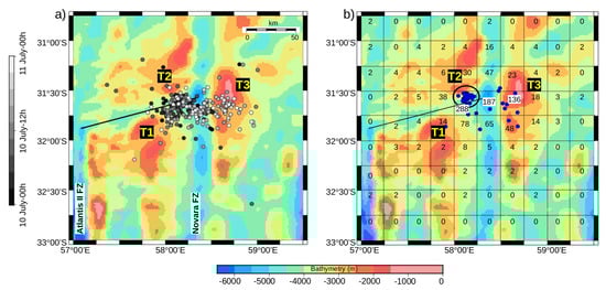 (a) Temporal distribution of location of events between 10 July at 00h and 11 July at 00h. T1, T2, and T3 are local bathymetric highs in the swarm-1 region. The black line shows the axial valley in Segment 18. The gray color scale denotes the origin time of events from 10 July at 00h to 11 July at 00h. (b) Location of all impulsive events (blue dots). Numbers in grid squares are the total event count in each ¼th grid of latitude and longitude for the entire swarm duration; the highest counts among the seamounts are highlighted in white.